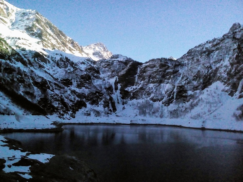 Lac d'Oô, en hiver. La grande cascade est gelée..